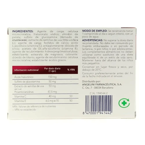 Complemento alimenticio a base de ácido hialurónico, glucosamina, proantociadinas y vitaminas C y E.