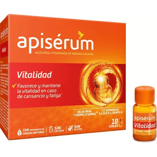 Apisérum Vitalidad es un suplemento nutricional elaborado con 200 mg de jalea real y 12 vitaminas esenciales para ayudar a reducir el cansancio y mantener en la mejores condiciones el sistema inmune.