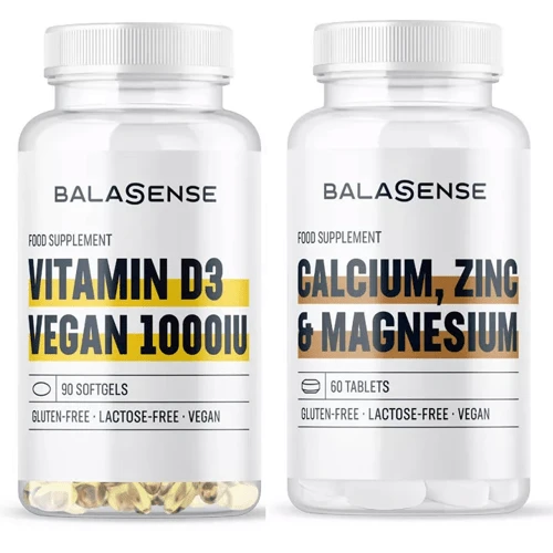 Balasense Calcio, Magnesio y Zinc 90 Comprimidos + Vitamina D3 Vegana 1000UI 90 Perlas