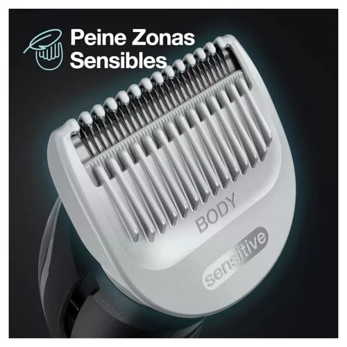 Contenido de la caja: 1 recortadora corporal con cabezal de paso fino, 1 peine para zonas sensibles, 1 peine fijo (3 mm), 1 peine fijo de paso fino (1 mm).
