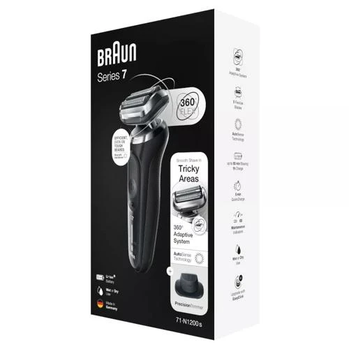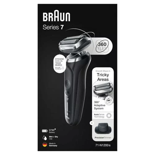 Braun N1200s Series 7 71 es una afeitadora eléctrica que cuenta con una cabeza de afeitado flexible en 360°, lo que permite adaptarse a los contornos del rostro para lograr un afeitado más preciso y cómodo.