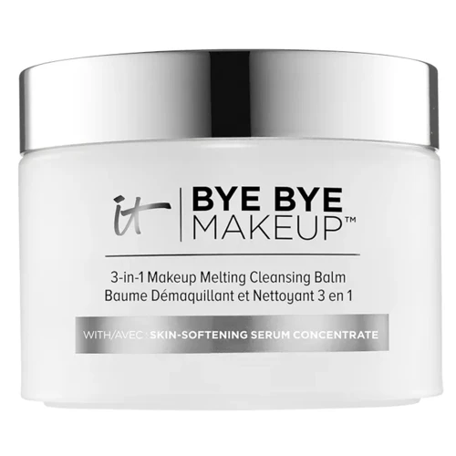 El Bálsamo Fundente 3 en 1 Bye Bye Makeup de IT Cosmetics es una lujosa fórmula que funciona como desmaquillante, bálsamo limpiador y sérum antiedad, ideal para eliminar el maquillaje y limpiar la piel de forma fácil.