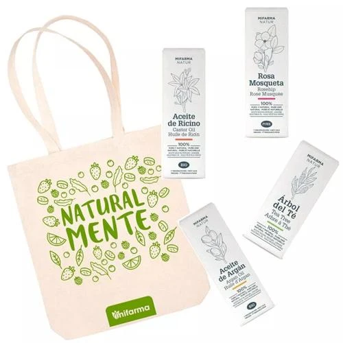 Este exclusivo pack se compone de 4 aceites de la marca de cosmética natural Mifarma Natur: ricino, rosa mosqueta, árbol del té y argán. Además, incluye de REGALO una bonita y práctica bolsa de tela.
