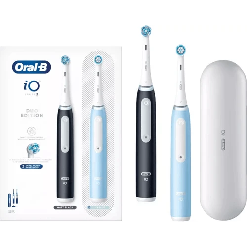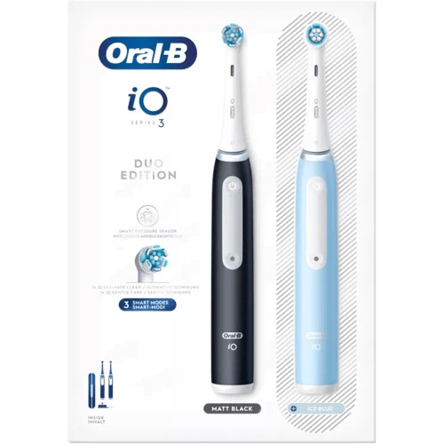 El Oral-B Cepillo Eléctrico iO3 Duo en color Negro Mate/Azul es un práctico conjunto que incluye dos cepillos eléctricos.