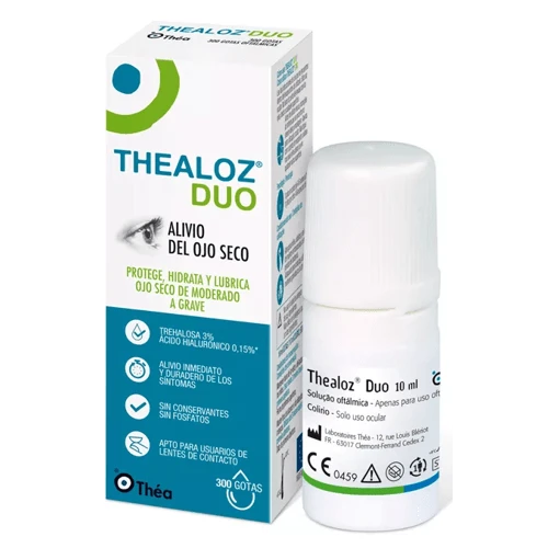 Thealoz Duo son unas gotas para los ojos que proporcionan una protección, hidratación y lubrificación del ojo para el tratamiento de la sequedad ocular moderada o grave.